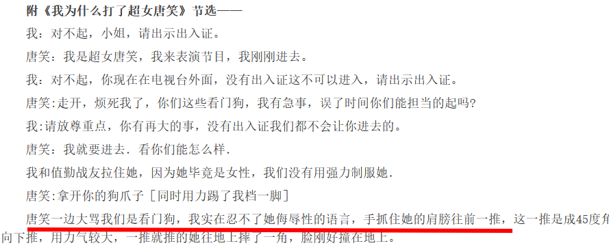 事后。一位署名为“打唐笑的武警战士”在论坛上发表《我为什么打了超女唐笑》的帖子,讲述当天的事发经过,并表示当时唐笑不出示证件,而且侮辱武警战士是“看门狗”,一气之下才误伤对方。