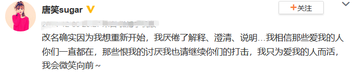 唐笑曾发文解释改名的原因:改名确实因为我想重新开始,我厌倦了解释、澄清、说明…我相信那些爱我的人你们一直都在,那些恨我的讨厌我也请继续你们的打击,我只为爱我的人而活,我会微笑向前~