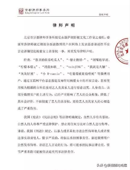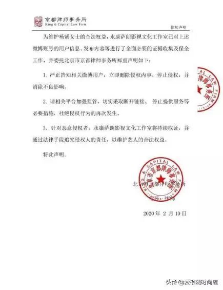 2月10日,杨紫的工作室发布了律师声明,指出“在流行肺炎的时候,公共资源不应该被占用,但谩骂和人身攻击可能继续升级,甚至影响亲人......”下面是杨紫的律师的说法,杨紫举报10个微博用户。这些用户都是大V的,而且有很多的粉丝...…这是自她出道之后第一次以这种方式捍卫自己的权利。