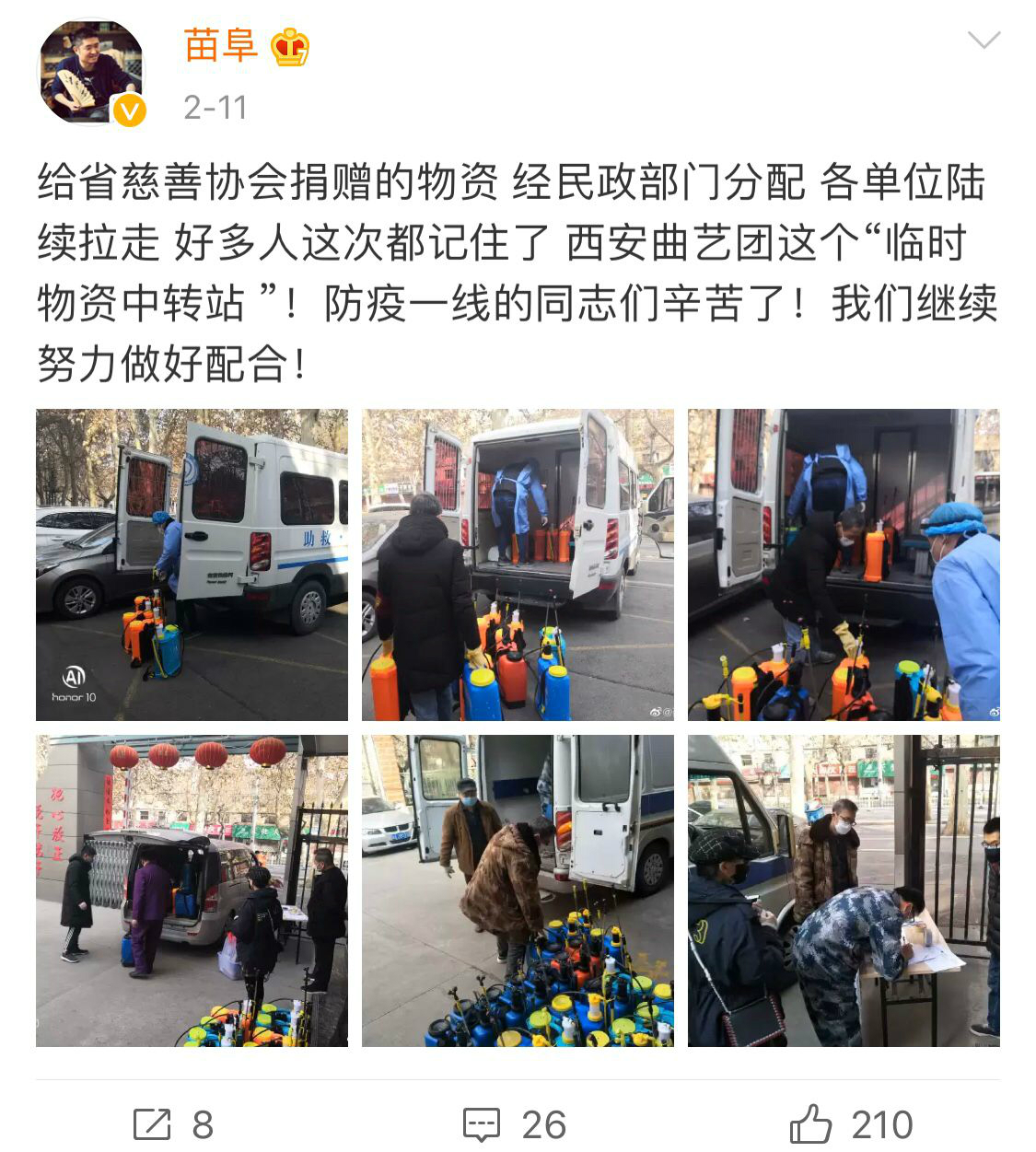 这段时间以来,苗阜为疫区筹集、捐赠了不少紧缺物资,诸如消毒液、口罩、防护服、酒精等等。