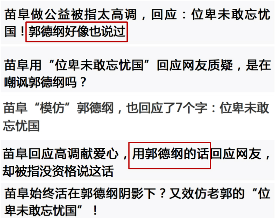 由于在回应的时候,苗阜引用了陆游的诗句“位卑未敢忘忧国”,又被部分网友吐槽称,苗阜模仿、效仿郭德纲,蹭郭德纲的热度。