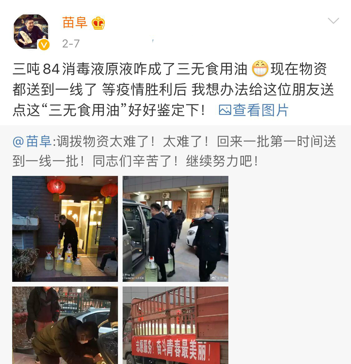 之前不久,就有网友根据图片臆断,苗阜给疫区捐了“三无”食用油。
