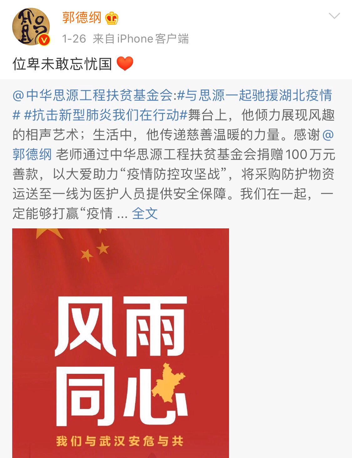 曲艺界也同样没有闲着。比如郭德纲,不仅捐款两次,还给武汉疫区捐赠了一辆负压救护车,可谓是功德无量。