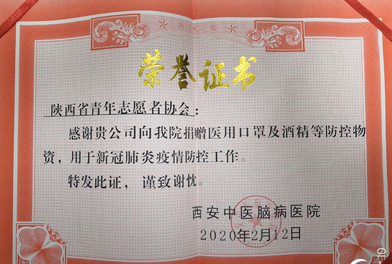 从图片可以看到,这是一张荣誉证书,是西安中医脑病医院发给陕西省青年志愿者协会的。