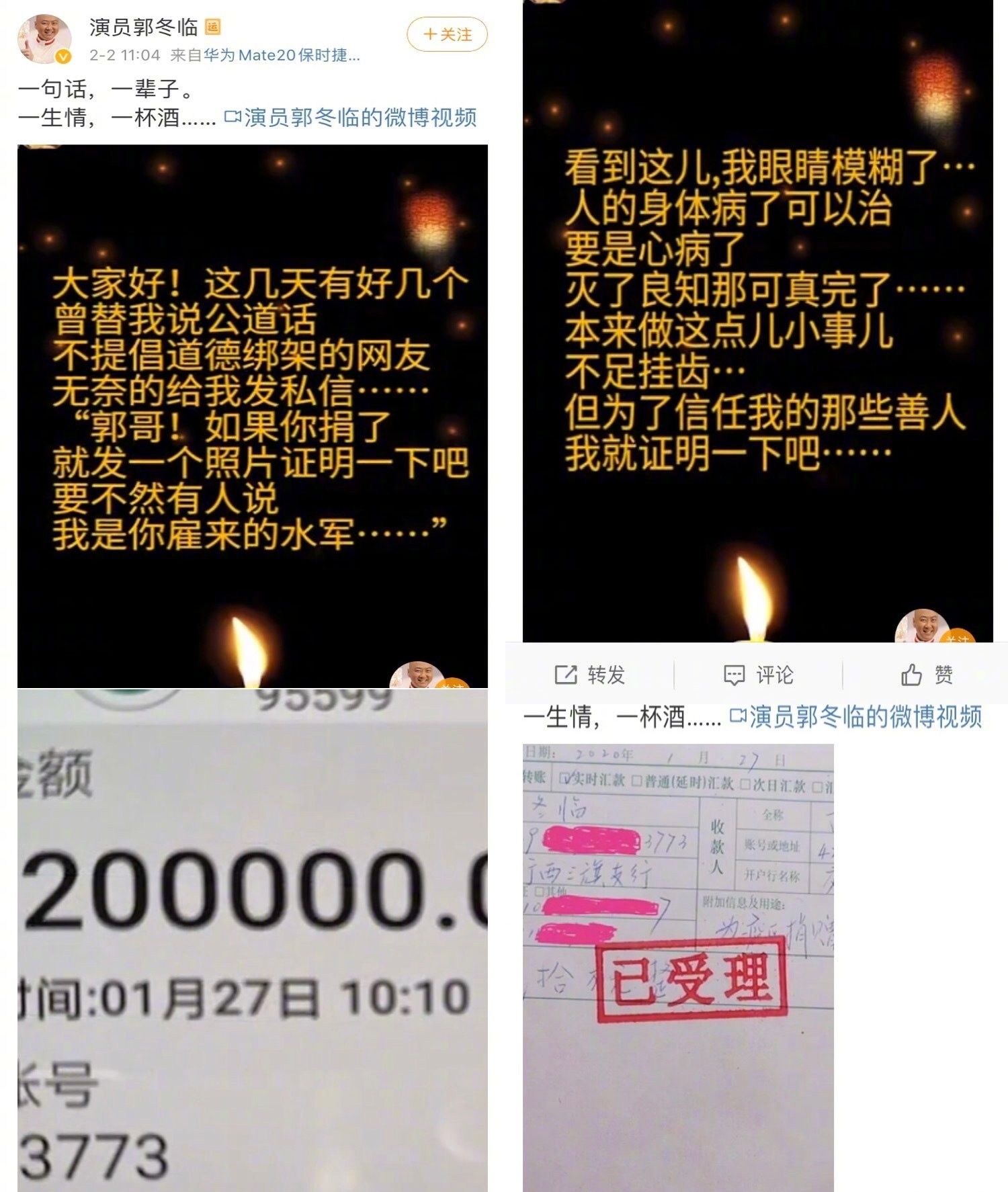 郭冬临捐过20万,却有网友说他没有捐。粉丝为证明郭冬临捐了,恳请郭冬临晒捐款收据。