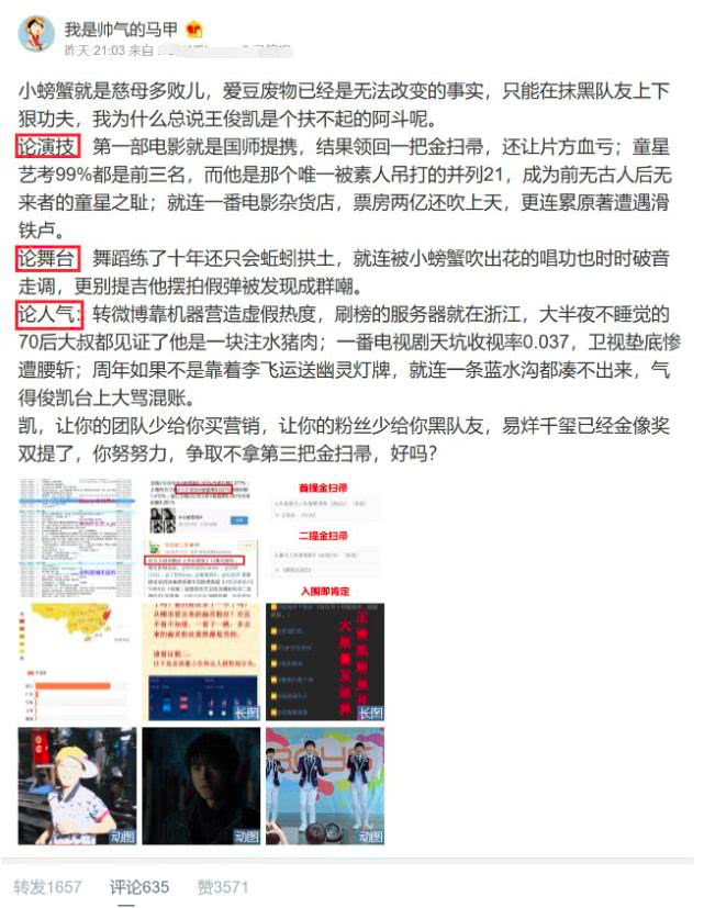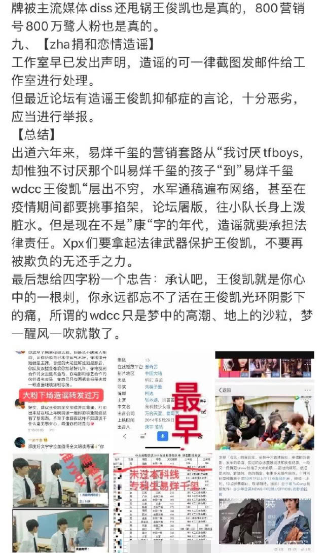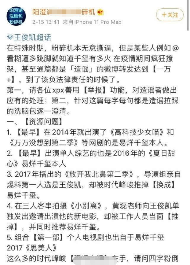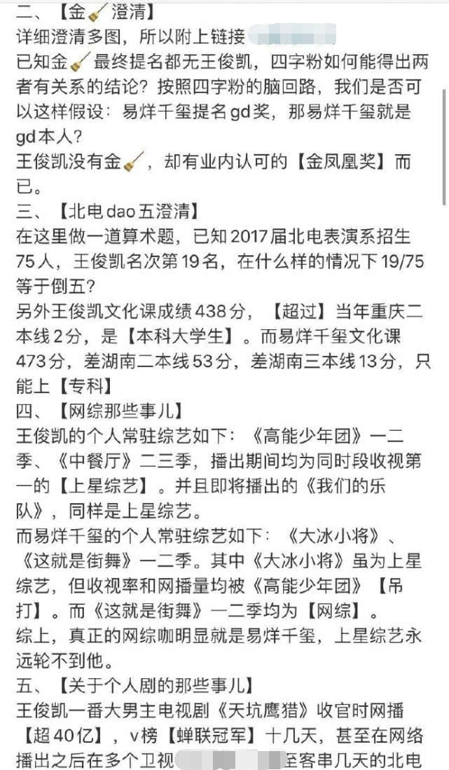王俊凯粉丝先是发布了长文,号召粉丝们发动“举报”,对造谣者作出应有的处理,还在长文中对易烊千玺发布的文章逐一澄清。关于资源问题,王俊凯粉丝表示是易烊千玺粉丝倒打一耙。金扫帚问题,王俊凯粉丝澄清最终获奖者根本就不是王俊凯,并且还获得了业内认可的“金凤凰奖”。考试成绩北电倒数第五,王俊凯粉丝澄清,当时王俊凯是北电第十九名,何以能和倒数挂钩。关于网综,粉丝也罗列了清晰的数据,《高能少年团》在线观看(✪ω✪)《中餐厅》在线观看(✪ω✪)《我们的乐队》均是上星综艺,其中《高能少年团》还吊打了易烊千玺上星的《大冰小将》在线观看(✪ω✪),并表示易烊千玺才是名副其实的网综咖,上星综艺永远轮不到他。
