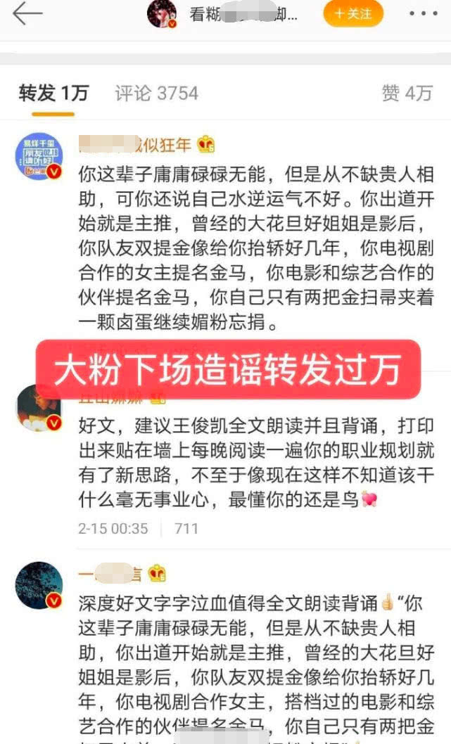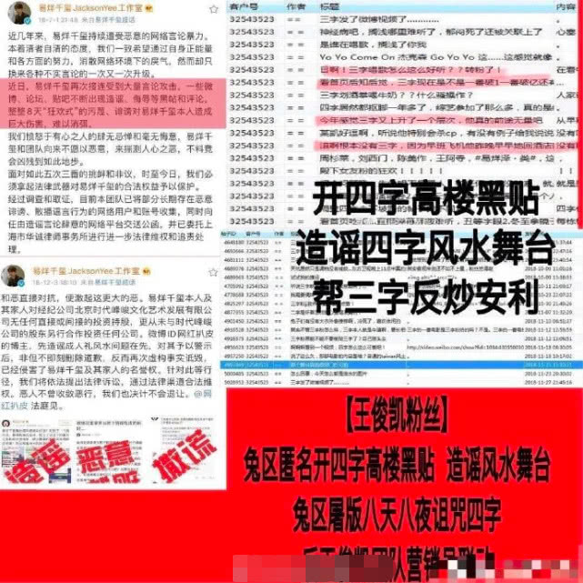 为此易烊千玺粉丝还贴出了数张“佐证”截图,表示王俊凯不论是演技、舞台、人气都有很高水分,根本就没有任何的闪光点。2月15日,王俊凯粉丝发动反击,表示要易烊千玺粉丝负法律责任。随后,易烊千玺粉丝则号召粉丝卡断王俊凯反黑站,双方战火激烈。