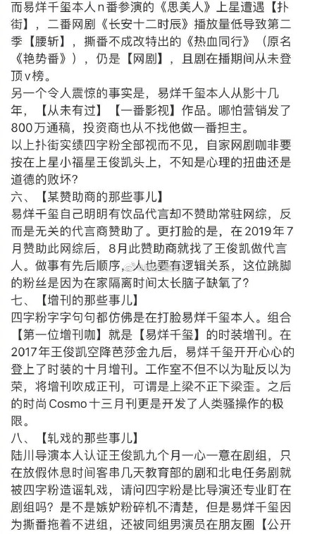 关于赞助商的问题,王俊凯粉丝表示,易烊千玺明明有饮品代言,却从不赞助自己的常驻网综。更打脸的是,易烊千玺的代言赞助了网综之后,转眼就换了王俊凯做代言。王俊凯粉丝还表示,易烊千玺才是第一位增刊咖,工作室还将增刊吹成正刊,被王俊凯粉丝讽刺是上梁不正下梁歪。关于轧戏的问题,王俊凯粉丝也表示,都是易烊千玺粉丝造谣,还表示易烊千玺拥有800万个营销号,800万个路人粉。