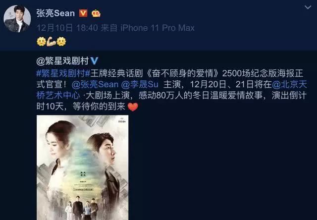 2019年12月10日,张亮在微博上宣传了一下自己要在12月20、21日在某个大剧院演话剧。