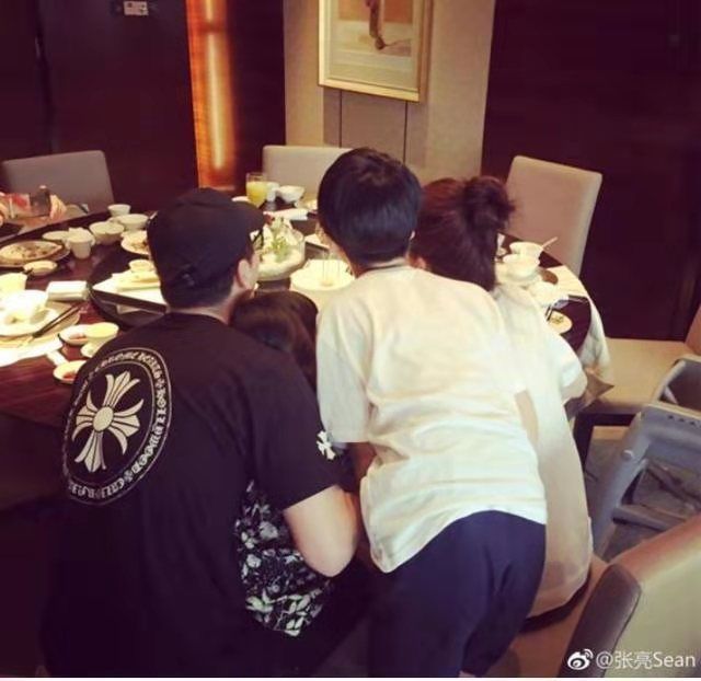 2018年一家四口还亲昵的凑在一起家庭聚会。