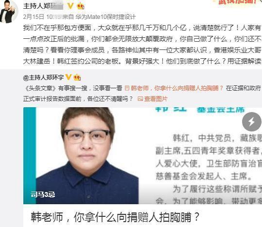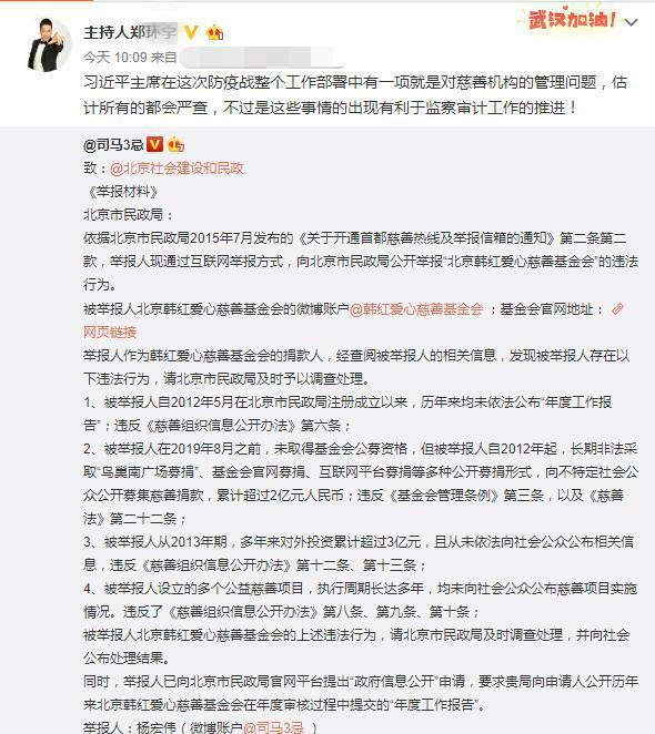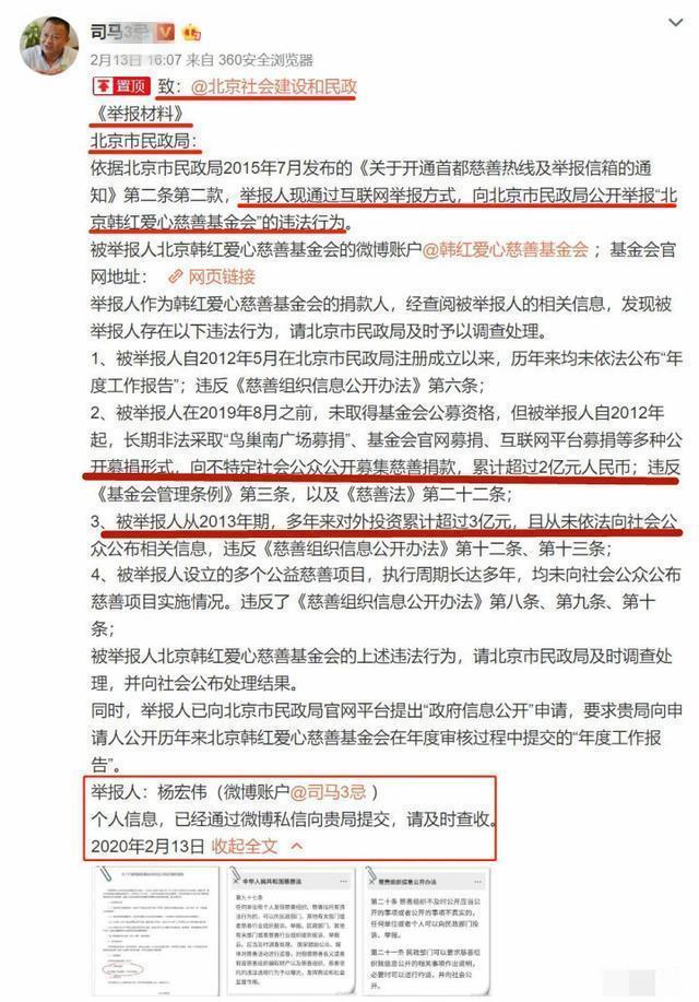 由师伟打开方向之后,司马就沿着这条路,通过实名举报提供材料,加大火力主攻韩红的基金会!在被知名律师举报后,司马改变方向,说自己没说韩红,而是韩红基金会的理事长!