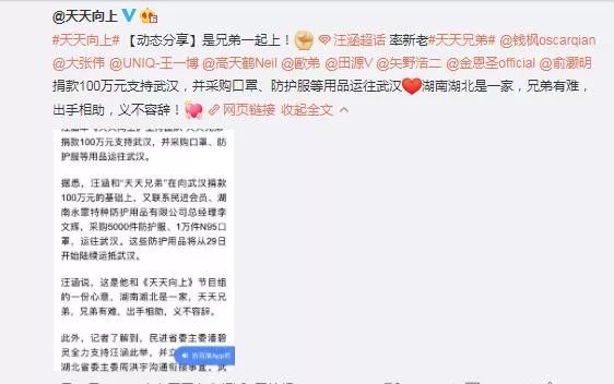 天天兄弟作为暖心的主持团队,不仅矢野浩二为武汉捐赠13万个口罩,王一博称愿意为建设雷神山火神山医院帮忙,作为老大哥的汪涵,还率领天天兄弟的新老成员一起支持武汉。