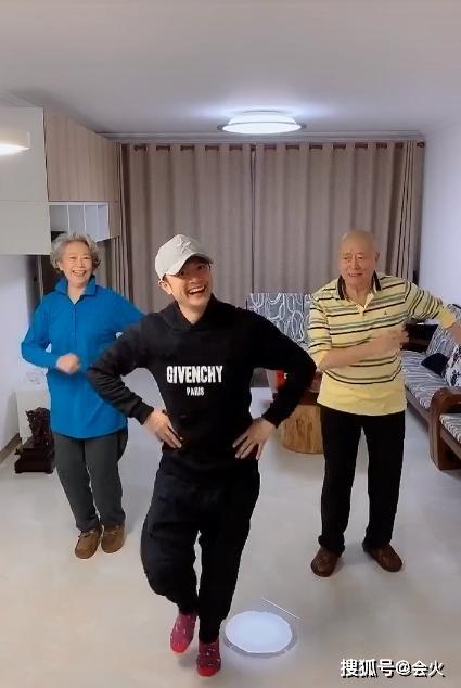 视频中印小天身穿成套黑色居家运动服,头上戴着棒球帽,看起来精神愉悦,十分开心。印小天的父母也是一身居家打扮,认真跟着儿子的步伐做动作,一家人其乐融融很有爱。