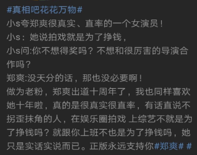只是郑爽对于演戏并不那么热衷,也没有那么多的钻研精神,她也坦言赚钱才是自己的人生目标。虽然她现在还能演一演偶像剧女主,但随着年龄的增长,未来的发展会怎样还未可知。