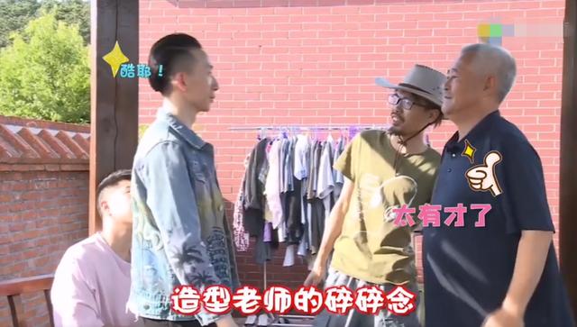 设计完之后,赵本上往后退两步,然后站姿挺拔十分认真的看着自己的“作品”。而年轻艺人则乖巧的站立在旁边,等待师傅赵本山的“检阅”。