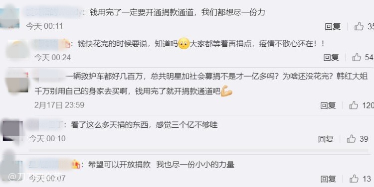由于韩红基金会早就宣布不再接受各界捐款,所以今天基金会公布了驰援湖北驰援武汉的项目进度之后,不少网友温暖留言:“钱花完了一定要说啊!”“我们都想尽一份力!”