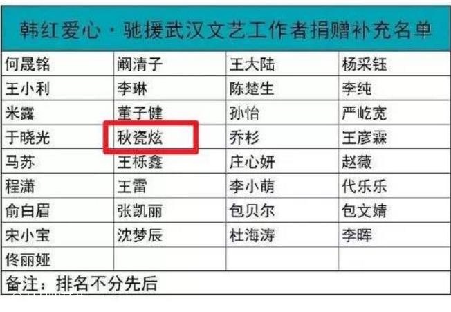 于晓光和秋瓷炫夫妇,他们早早就向韩红基金会捐款,也发文力挺韩红。