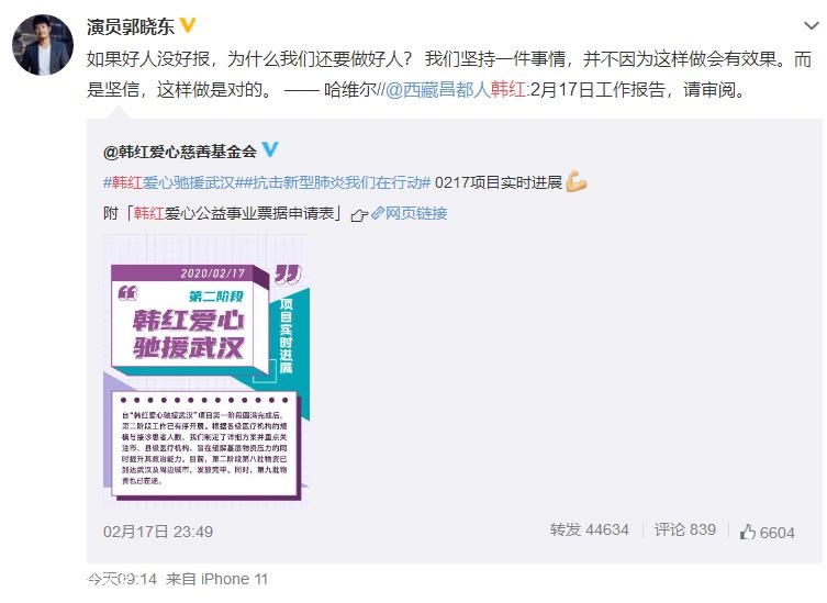 2月18日上午,演员郭晓冬发文力挺韩红:“如果好人没好报,为什么我们还要做好人?我们坚持一件事情,并不因为这样做会有效果,而是坚信,这样做是对的”,他援引了哈维尔的话,字字珠玑啊!