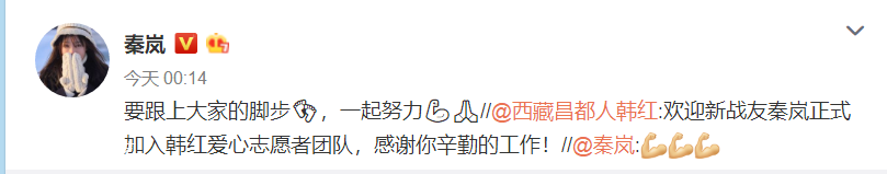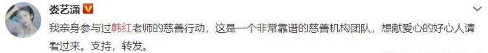 她曾在韩红基金会当过志愿者,早在1月25日就发文说:“我亲身参与过韩红老师的慈善行动,这是一个非常靠谱的慈善机构团队。”