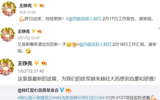 王铮亮不仅每天都转发更新韩红基金会的进度,更早在1月27日就发文说:“为我们的铁军越来越壮大而感到自豪和骄傲!”