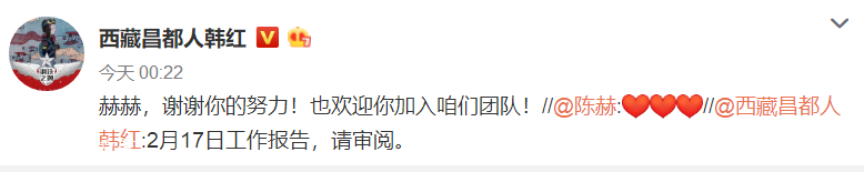 陈赫,曾经跟着韩红踏上“援甘”之旅,他也发了3颗红心力挺韩红,韩红今日转发说:“赫赫,谢谢你的努力,也欢迎你加入咱们团队!”