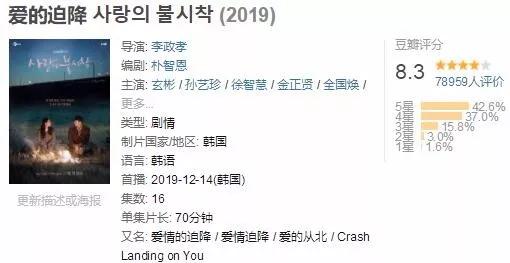 颜值即是正义,虽然比不上《请回答1988》和《鬼怪》,但《爱的迫降》的口碑也不错,在豆瓣平台,该剧稳拿8.3分,五星好评高达42.6%,对于一部偶像剧来说,这样的口碑的确相当出色,也难怪《爱的迫降》会火成今年的收视爆款。