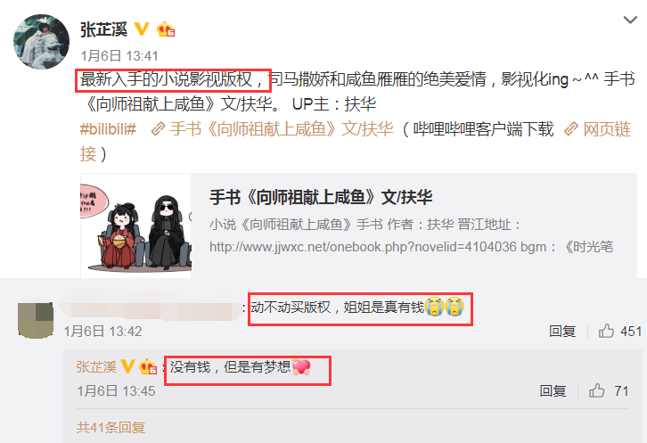 前不久,张芷溪在微博透露,她又购买了新的小说影视化版权。有网友评论道:“动不动买版权,姐姐真有钱”,张芷溪回复说:“没钱,但有梦想。”