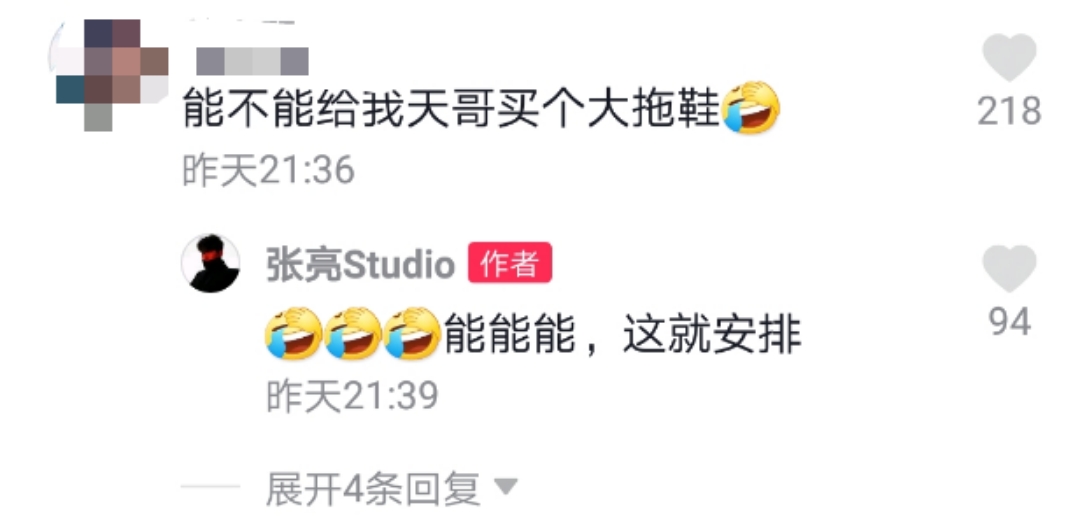 还有不少网友注意到了天天脚下的那双拖鞋,天天的脚后跟都踩在了外面,网友们纷纷吐槽道:“能不能给我天哥买个大拖鞋?”张亮也回复道:“能能能,这就安排。”个子长得快的天天,脚的大小也在跟着长,这可不能疏忽啦。
