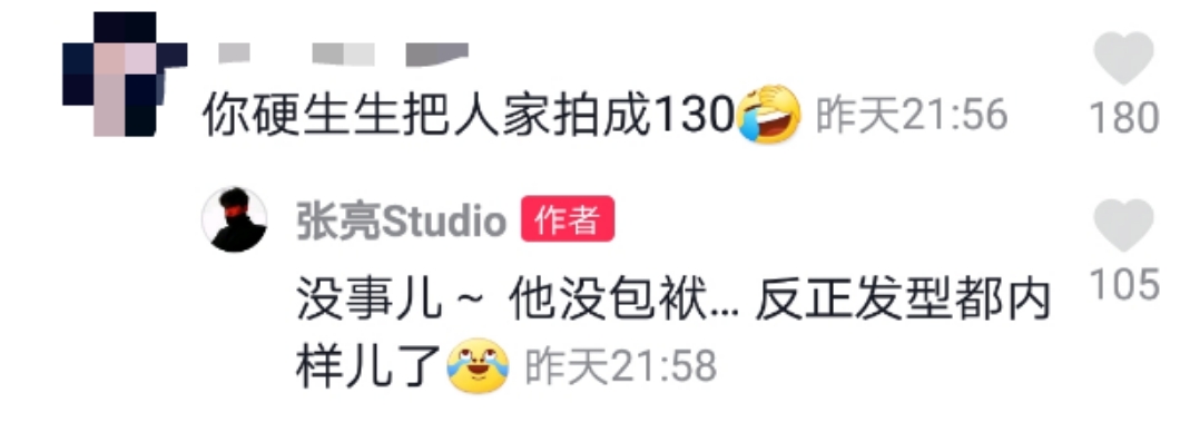 不过张亮的身高足足接近一米九,有网友吐槽道,天天在张亮的镜头下仿佛被拍成了只有一米三,张亮也不在意地回复道:“没事儿,他没包袱…反正发型都内样儿了。”