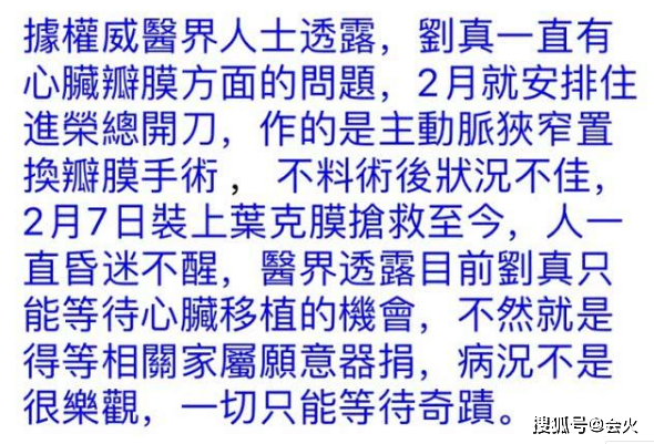 据悉,刘真其实一直有心脏方面的问题,早在2月初就住进了医院做相关治疗手术。但是术中心脏突然骤停,进行了抢救,术后恢复情况也不太理想,情况不容乐观。