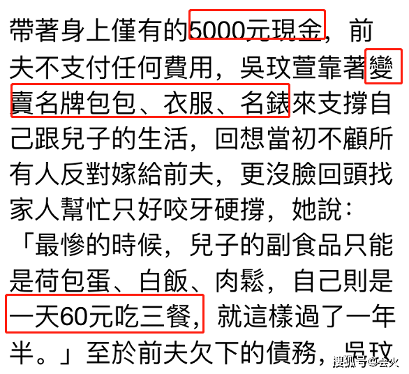 吴玟萱立即当着儿子离开了家,但当时她身上只有5000元现金(相当于1163元人民币)。吴玟萱心酸地表示,她只能靠变卖首饰、名牌衣服和包包才能养活儿子,最穷的时候,她一天三餐只花60块钱(相当于14元人民币)。