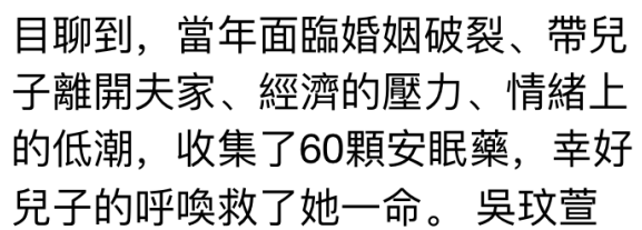 在节目中,吴玟萱自曝,2001年离婚时,她因情绪低落、压力过大,险些吞安眠药自杀。是儿子及时出现,才让她放弃了这个想法。