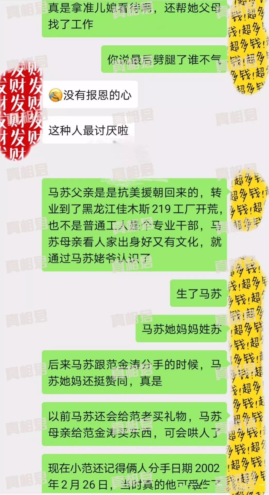 马苏和范金涛在一起后,依靠范金涛爸爸的关系进了北电,后来马苏一家也来到北京。当时既没钱又没工作的马苏一家,在范金涛家住过一段时间。范金涛爸爸掏钱给马苏一家安排了两居一室的住所,还帮马苏父母找了工作,可谓是把马苏当准儿媳。