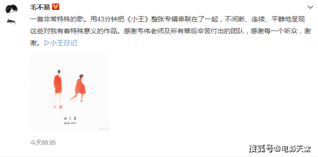 可是虽然毛不易离开了《歌手》的舞台但是他并没有放弃自己该做的努力,今天凌晨毛不易在社交平台上发布动态向大家公布自己的新曲,特意表明是很特殊的一首歌,《小王日记》把自己的整个专辑串联了起来,粉丝称像是在讲述人一生的故事。