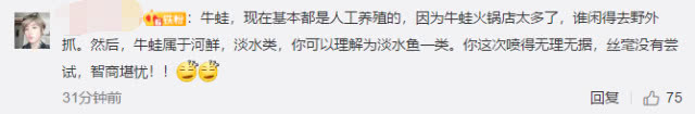 网友果然就坐不住了,看到刘信达刻意碰瓷,就嘲讽道:“牛蛙现在基本都是人工养殖,也属河鲜,淡水类。你这次喷得无理无据,丝毫没有常识,智商堪忧!”还有网友很幽默的讥讽刘信达:“刘大师如一盏明灯照亮了整个娱乐圈。”