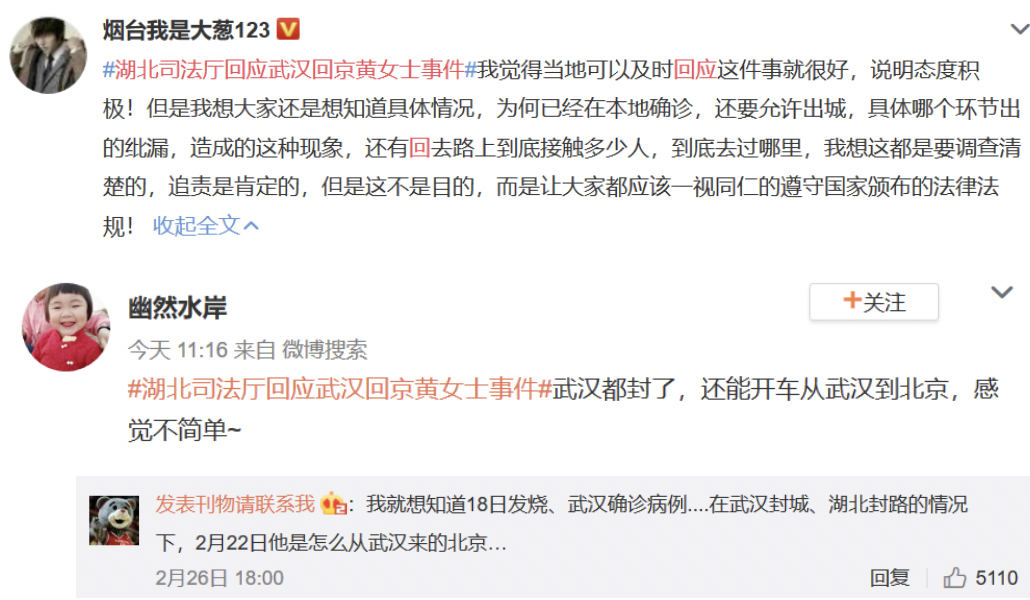 新华锐评:“在离汉通道关闭的情况下,这位H女士是如何出的城?这个问题有必要说清楚。如果确实有特殊原因,并且是经过批准后离开武汉的,相信大家也都能够理解。如果是通过不正当渠道出城,就说明武汉在相关规定执行上出现了漏洞,必须一查到底,追究相关人的责任,并及时补漏。作为疫情防控的重中之重,武汉的防疫事关战‘疫’成败,容不得任何闪失!”