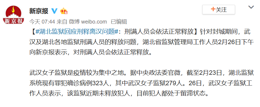 针对封城期间,武汉及湖北各地监狱刑满人员的释放问题,湖北省监狱管理局工作人员2月26日下午向新京报表示,对刑满人员会依法正常释放。网络中#湖北监狱回应刑释离汉问题#成为热点话题。