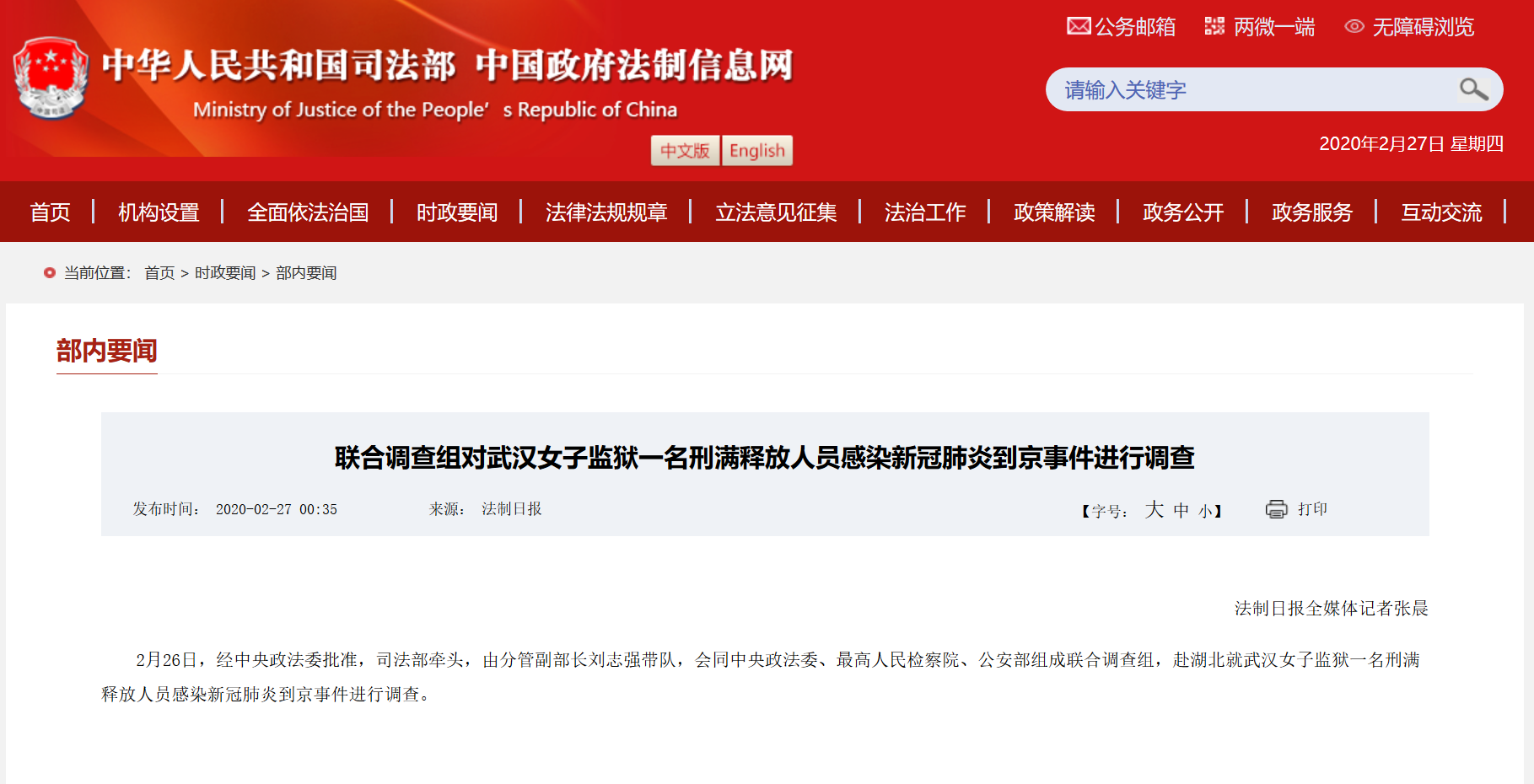 目前,中央多部门组成的联合调查组已介入调查。中华人民共和国司法部网站、法制日报、@人民日报、@新华视点等发布消息称:“26日,经中央政法委批准,司法部牵头,由分管副部长刘志强带队,会同中央政法委、最高人民检察院、公安部组成的联合调查组,赴湖北就武汉女子监狱一名刑满释放人员感染新冠肺炎到京事件进行调查。”