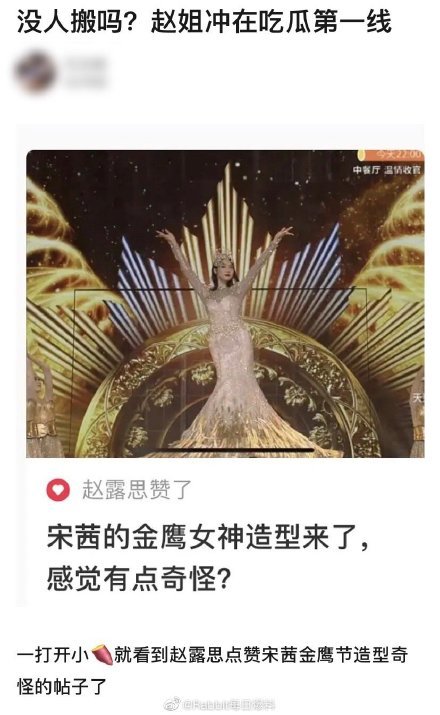 赵露思上网不小心点赞了吐槽宋茜金鹰女神造型奇怪的帖子,引发热议。