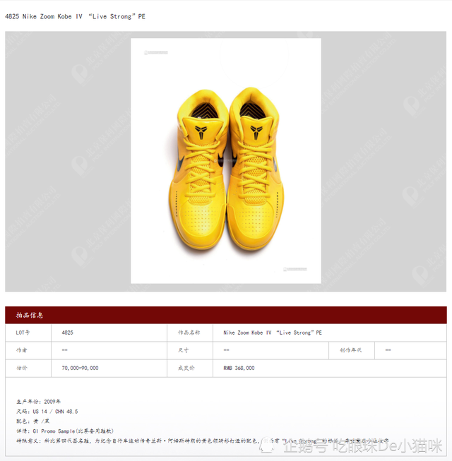 科比战靴一双32万元,其实就是在此次10月19日北京保利拍卖会上,9双球鞋又加价2万元至80万元。最终,这组起拍价50万元的“科比·布莱恩特纯白系列球鞋”以80万元落槌,成为10月19日北京保利拍卖十五周年庆典拍卖会玩趣收藏球鞋专场的“标王”。 加上佣金,这9双鞋的成交价92万元,每双约10.2万元。这还不是全场单双最贵的球鞋。通体灿黄的“Nike Zoom Kobe IV ‘Live Strong’PE”,是已故NBA球星科比·布莱恩特的比赛备用鞋款,堪称“黄金战靴”,估价7万元至9万元,以32万元落槌,加佣金成交价36.8万元,相当于1斤7两重的黄金。