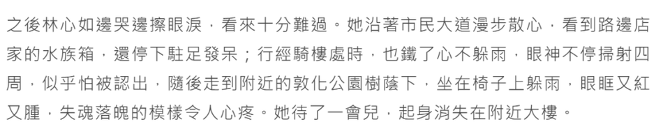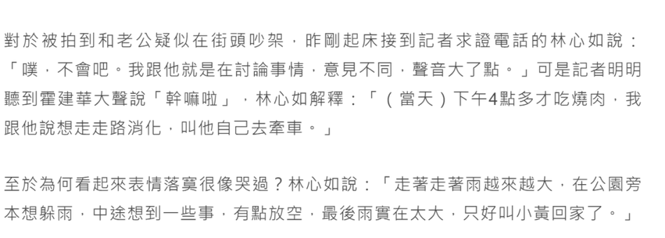 原标题:林心如回应与霍建华吵架 拌个嘴而已,都散了吧! 近日,台媒曝林心如与老公霍建华当街吵架,随后夫妻俩分道扬镳林心如在路边流泪。 台媒称,林心如和霍建华夫妻俩外出逛街,起初还手牵手十分恩爱,随后不知什么原因当街吵架,霍建华拉林心如的手安慰,却被林心如大声喊:“干嘛啦!”,随后夫妻俩在街头分道扬镳。而与老公吵架后,林心如走到路边哭泣,不停擦拭眼泪,还坐在路边发呆,因为当时外面下着雨,林心如却也不躲雨,任凭雨水滴在身上。林心如似乎怕被拍到,不停环顾四周,随后走到公园的树荫下,坐在椅子上躲雨,眼睛红肿,看起来失魂落魄,不一会林心如便起身离开。 台媒还称,霍建华与林心如吵架后,心情也似乎非常不好,独自买了食物后驾车离开,期间好像并没有去接林心如,直接驾车回家。 台媒随后向林心如求证,林心如回应:“不会吧,我们只是在讨论事情,意见不同声音大点而已,自己也是想走路消化下食物,让老公自己去开车。”她还解释称因为雨越下越大,在公园躲雨时想到些事所以会发呆,后来因为雨太大只好叫了出租车回家。