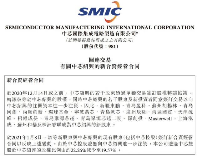 于2021年1月8日,该等新股东与中芯绍兴的现有股东(包括中芯控股)签订新合资经营合同以反映上述变动。由于中芯控股并无向中芯绍兴进一步注资,本公司透过中芯控股于中芯绍兴的股权比例由约22.26%减少至19.57%。