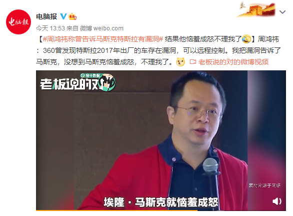据媒体报道,近日,周鸿祎称360曾发现特斯拉2017年以后出厂的车存在安全漏洞。没想到把漏洞告诉了马斯克后,他却恼羞成怒不理自己了。