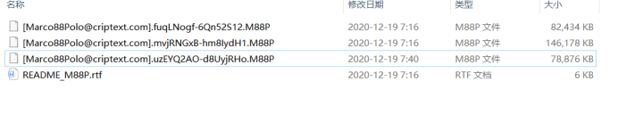 远程到客户中毒的服务器上看到所有文件都变成文件名为[邮箱]+随机码+m88P的格式,难怪客户会说文件都不见了。文件名前后两段格式是固定的,只有中门的随机码不同,判断这串随机码是用原来的文件生成的,在每个文件夹下都有一封文件名为README_M88P.rtf的勒索信,内容如下: