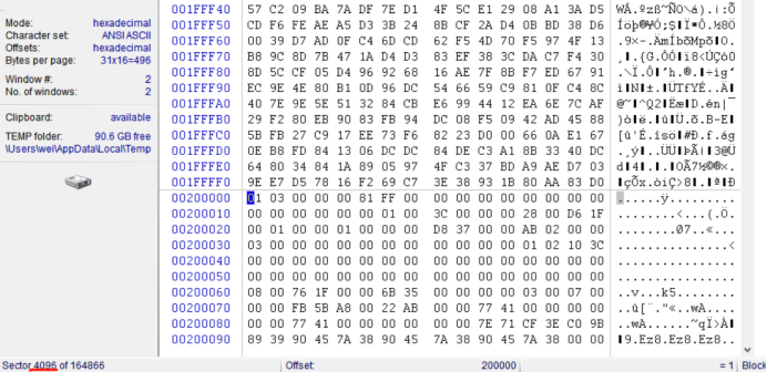 用文件底层分析工具打开被加密的文件查看,可以看到文件前4096个扇区被加密:
