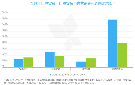 AppsFlyer 近日正式发布 2020 年度盘点,数据显示,2020 年全球应用下载量较 2019 年提升 33%,但非自然安装(NOI)下降 27%——自然安装即纯粹由消费者主动带来的安装跃升将近 60%。