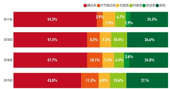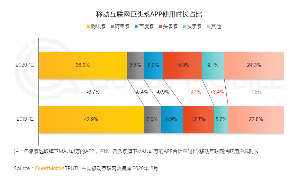 自2016年9月抖音上线后,更是成了“杀时间”的神器,下面两张图是移动互联网巨头 APP 使用时长的占比,可以看到,从2017年中到2020年底,字节跳动系从3.9%增长到15.8%,而腾讯系则从54.3%稳定下跌到36.2%,更有趣的是,除了另一个后起之秀快手,剩下的几大派系乃至其他的占比几乎都没变化,也就是说,头条要吃下多少,腾讯就要吐出来多少。