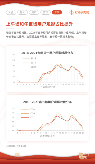从用户数据来看,本届春节档,80%的用户仅观看1部影片;双人结伴观影占比较2019年春节档降低7%,单人和多人观影侧则均有提升。因影院上座率依旧有所限制、春节档影片一票难求,用户观影时段集中度较往期春节档有明显降低,14:00-15:00场次依旧是最受欢迎的观影时段,与此同时,上午场和夜场观影占比有所提升。