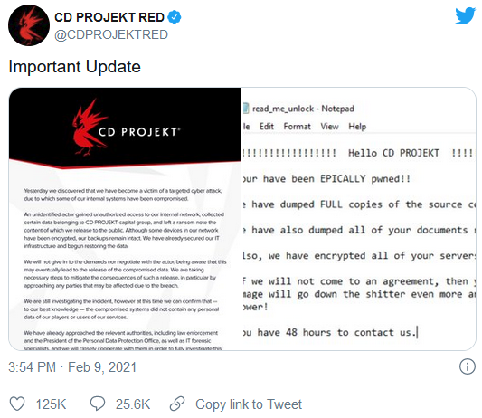 DMCA取缔通知的目标还有至少其他三个Twitter用户。他们的推文被一条标准的Twitter DMCA提示消息所取代,指出内容已被删除,以回应版权持有人的报告。CD Projekt Red上周宣布被黑客攻击,并发布了一张黑客要求的赎金截图。