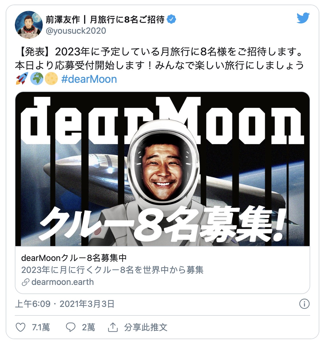 DoNews 3月4日消息(刘文轩)SpaceX 在 2018 年公布了首位私人月球旅行乘客,为 45 岁,身价约 20 亿美元的日本富豪前泽友作。他提出的“dearMoon”(亲爱的月球)计划表明,2023 年将邀请 6 到 8 名艺术家一起参与大约 6 天的绕月飞行,费用由他承担,条件是勇于挑战极限,并同样愿意帮助他人。
